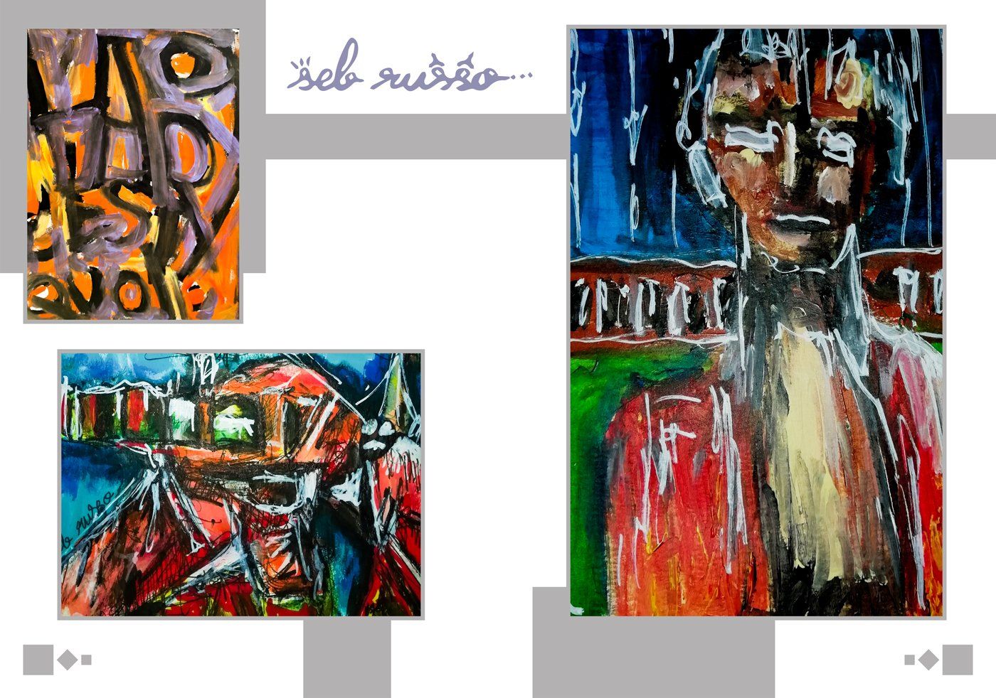 La mia opinione, che è la mia, e per questo ne ringrazio me stesso, consisterebbe anche nel pensare che Seb Russo è più un disegnatore che un vero pittore, i suoi lineamenti spuntano, si intrecciano, creano forme inaspettate, i volti sorgono, i corpi si intrecciano e si aggrovigliano e, a volte partendo da linee casuali, costruiscono vortici di figure, un caos proprio come quello della vita, commovente e creativo.